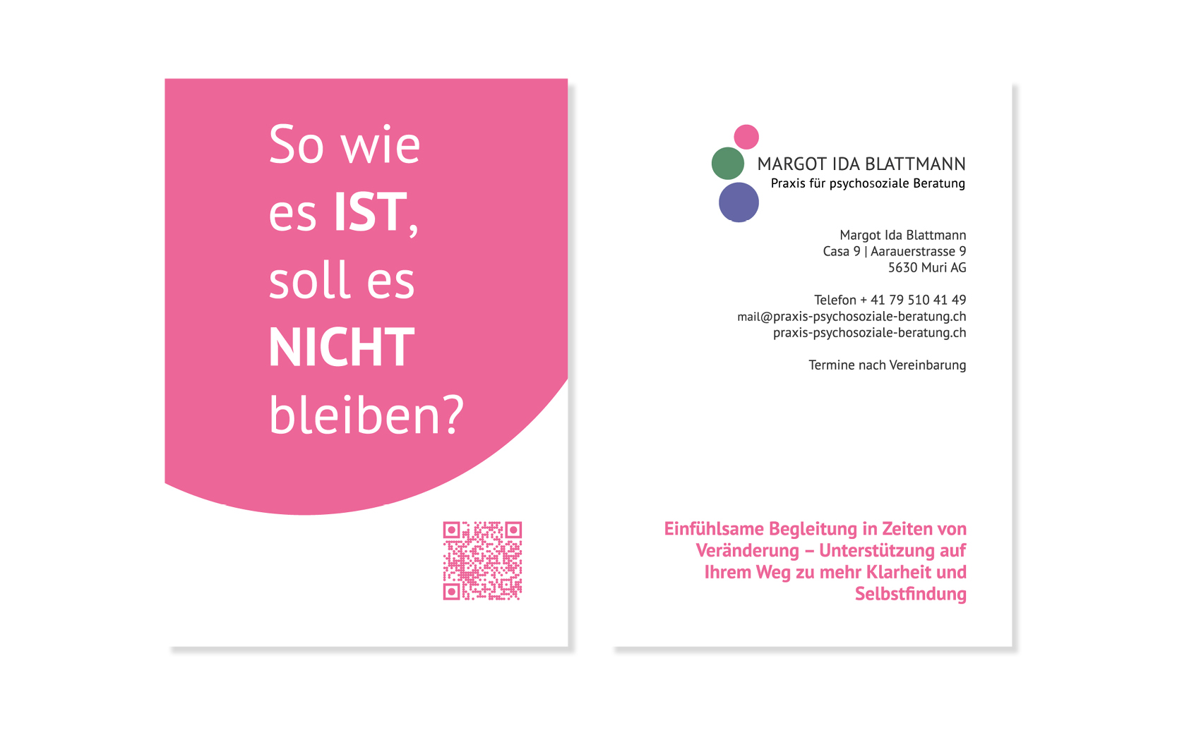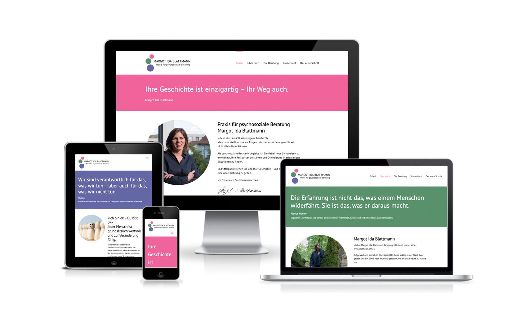 Für die neue Praxis von Margot Blattmann entstand ein ganzheitlicher Auftritt mit neuer Website, Branding, grafische Arbeiten und Fotoshooting in der Natur – zurückhaltend, klar und auf Vertrauen ausgerichtet.